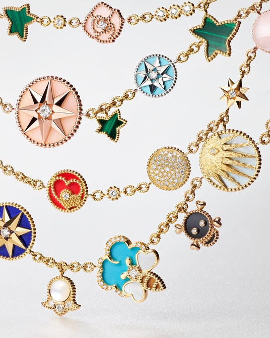 クリスチャン・ディオールの迷信深い性格も、「ローズ デ ヴァン」コレクションのインスピレーション源になりました。「ローズ デ ヴァン チャーム」は繊細なスズランや 蜂、愛着と忠誠の象徴であるアイビーといったモチーフをジュエリーのチャームに昇華させ、ムッシュ ディオールの「ラッキー スター」にオマージュを捧げた「エトワール デ ヴァン」も組み合わせました。