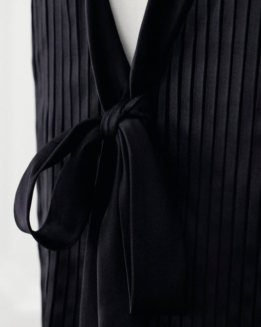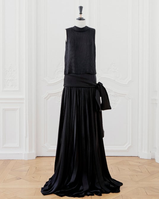 モニカ・バルバロが纏ったのは、ブラック クレープサテンドレスです。プリーツを施した腰でリボンを結ぶデザインのドレスは、ディオールのアトリエで、70時間をかけて完成に導かれました。