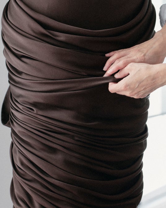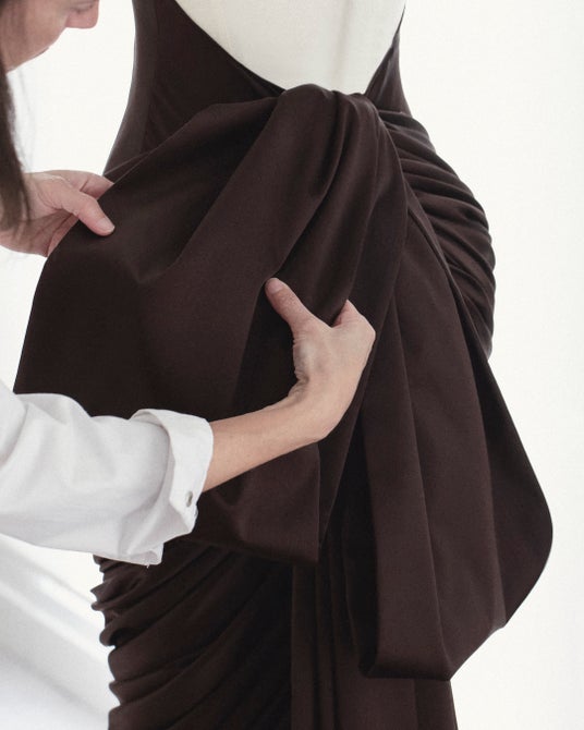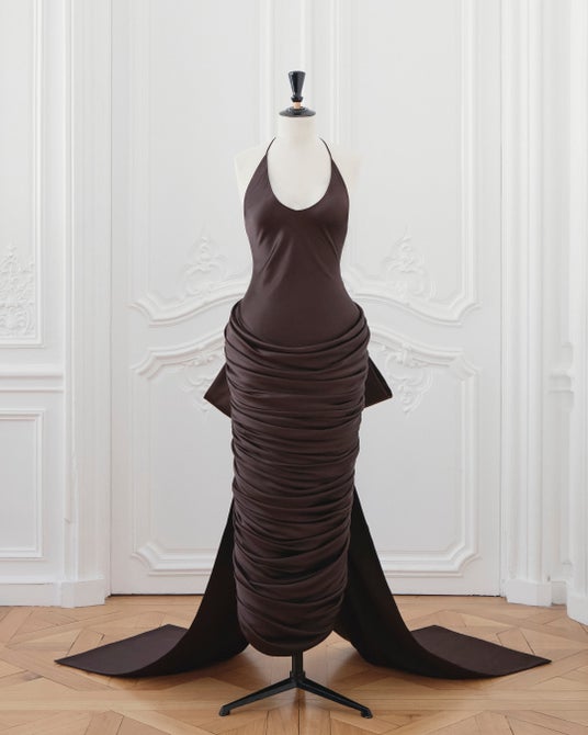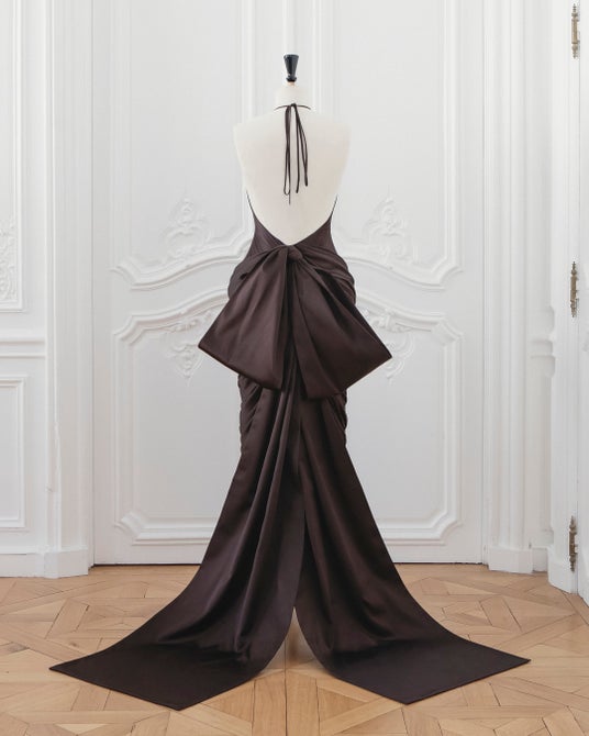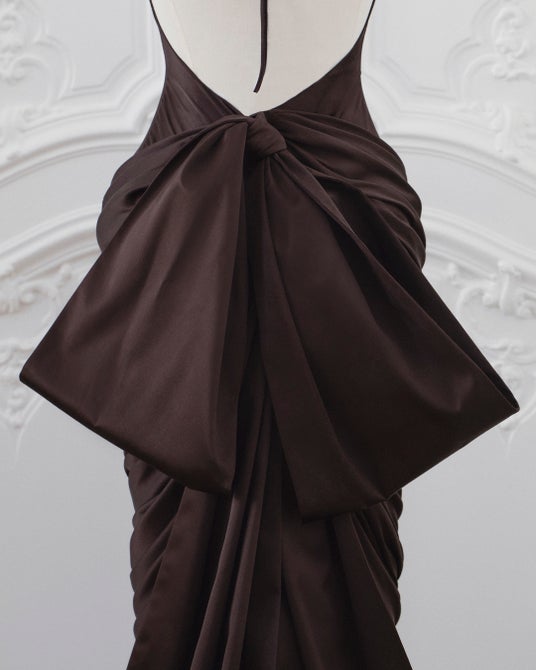 ミア・ゴスが纏った、ブラウンのクレープサテンドレスは、ドレープが施され、後ろはリボン結びで仕上げられています。このドレスは、75時間をかけて完成に導かれました。