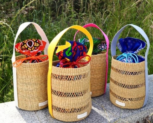 ガーナの女性たちが伝統技術で編み上げるバスケット。きめ細やかで上質な網目は、2週間の時間をかけて一つ一つ手編みされています。アフリカンファブリックの巾着との組み合わせで、楽しみ方は何通りにも広がります。