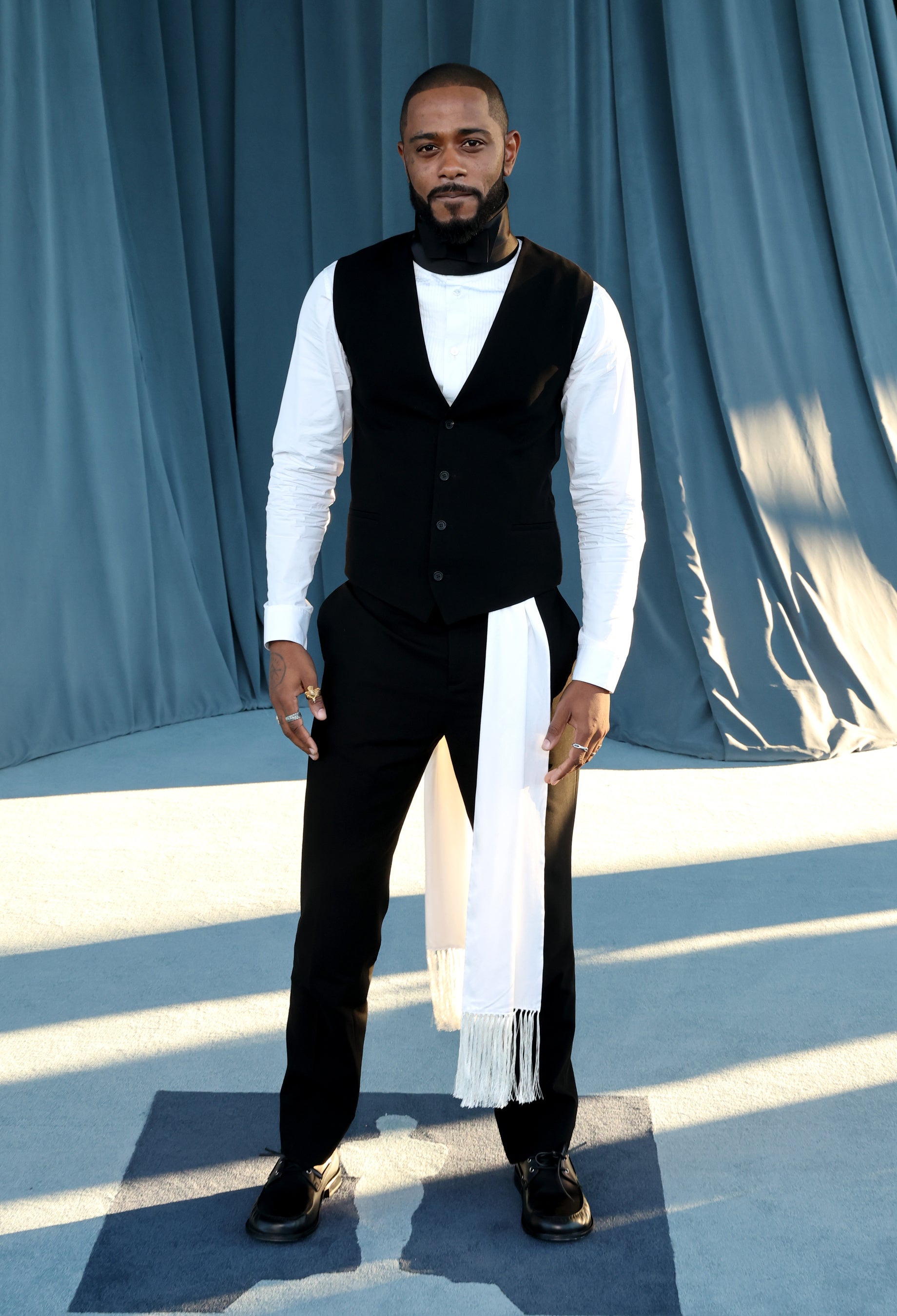 ラキース・スタンフィールドは、ブラックのコットンブレンドピケベスト、ホワイトコットンのポプリンシャツ、ブラックのウールパンツ、ホワイトのシルクスカーフ、ブラックのシルクノットネックバンドを着用し、ディオールのシューズを合わせました。