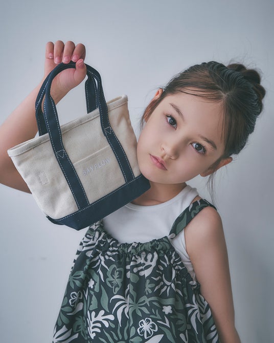 ウィメンズはTシャツ、パンツ、シャツ、ワンピース、トートバッグの 5 アイテムが登場します。忙しい毎日にも簡単 に着回しでき、コーディネートが決まるようにそれぞれで組み合わせられることもイメージして企画しています。また、 BAYFLOWのオリジナル商品でも人気の高いロゴトートバッグを本コラボ仕様にアップデートしています。お子様と 過ごす時間も気軽にお持ちいただけるようにショルダーを付け、マザーズバッグとしてもお使いいただけるようにサイ ズにもこだわりました。キッズは大人とお揃いのデザインでTシャツ、パンツ、ワンピース、バッグを展開いたします。