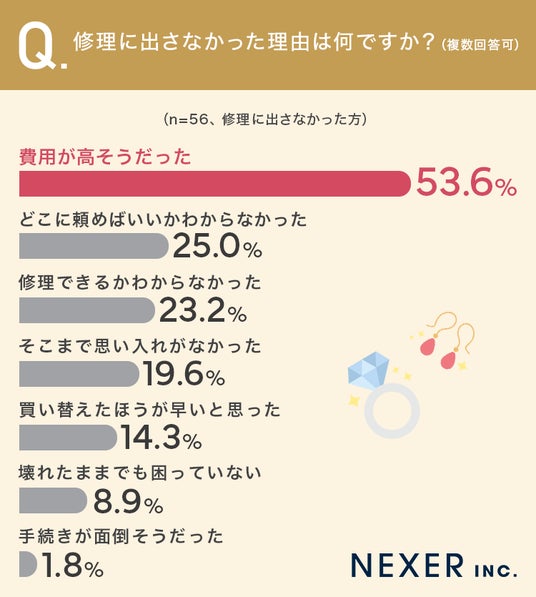 今回の調査では、ジュエリー・アクセサリー所有者の半数が「壊れたり傷んだりした経験がある」と回答した一方、そのうち修理に出した方は3割にも届かないという結果になりました。