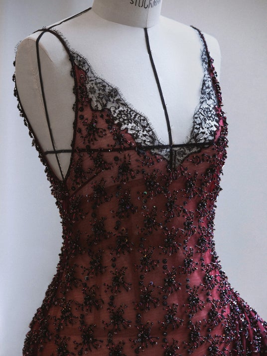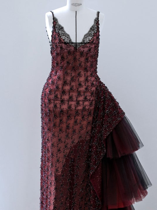 ミア・ゴスは刺繍をあしらったバーガンディーのレイヤードチュールドレスに、シューズとファイン ジュエリーを合わせました。