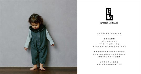 LOWRYS FARMの“カワイイ”を通して、お子さまとご家族に幸せを感じていただきたいという想いから、ベビーアパレル用品の監修を手がける運びとなりました。まだ何色にも染まらないピュアな姿を活かし、LOWRYS FARMならではのデザインを施し、無駄のない“カワイイ”アイテム全14 型をラインアップしました。