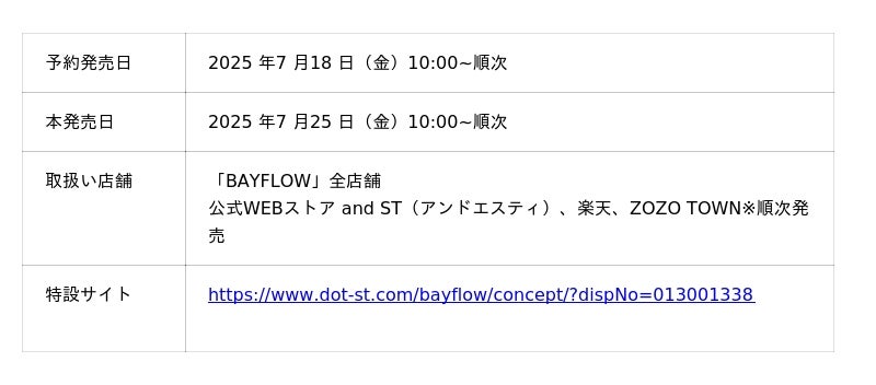 2025 年7月18日(金)より公式WEBストア and ST(アンドエスティ)で先行予約を開始します。また、2025 年7月25日(金)よりBAYFLOW全店舗と、公式WEBストア and ST(アンドエスティ)、ZOZOTOWNにて通常販売をスタートします。