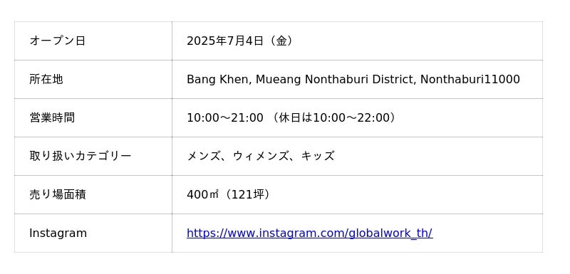 株式会社アダストリア(本部:東京都渋谷区渋谷2-21-1、代表取締役社長:木村 治)が展開するカジュアルブランド「GLOBAL WORK(グローバルワーク)」は、東南アジア初出店となる「GLOBAL WORK ザ・モール・ライフストア・ガムウォンワン」をタイ・バンコクの北の玄関口になるエリアであるノンタブリー市に2025年7月4日(金)オープンいたしました。