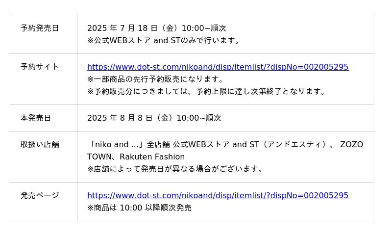 「niko and ...」 は、アパレルや雑貨、家具、飲食を展開する“style editorial brand”です。実用性だけでなく、どこかユーモアを感じさせるアイテムをラインアップしており、意外な驚きと発見に“であう”、やがて自分のライフスタイルに“にあう”。そんなメッセージのもと、20~30 代の男女に向けて事業展開しています。 全国 146 店舗展開(2025 年 6 月末時点、WEBストアを含む)。