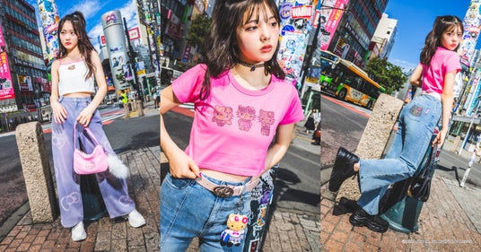 キラキラのラインストーンをあしらった、日焼けデザインのハローキティがかわいいトップスとフレアデニムパンツ、ハローキティのリボンがさりげなくコーディネートのポイントになるワイドホックデニム