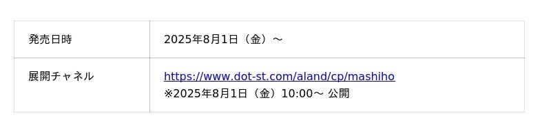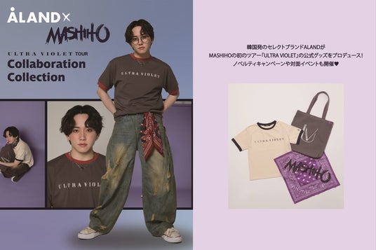 株式会社アダストリア(本部:東京都渋谷区渋谷2-21-1、代表取締役社長:木村 治)が展開する韓国発のセレクトブランドALAND(エーランド)は、世界的に人気がある日本出身のソロアーティスト「MASHIHO(マシホ)」の初のツアー「ULTRA VIOLET」の公式グッズをプロデュースいたしました。これを記念して、2025年8月1日(金)よりALAND全店と公式WEBストア and ST(アンドエスティ)にて先行発売を行います。公式WEBストア and STでは、ツアーグッズのTシャツをお買い上げ頂いたお客さまに、全5種類のALAND限定オリジナルトレーディングカードを1枚プレゼントする他、旗艦店「ALAND TOKYO」(東京・渋谷)では、ツアーグッズ(Tシャツ・トートバッグ・バンダナ全て)をご購入いただいたお客さまに先着で、2025年8月17日(日)に開催するMASHIHO本人に会える、ALAND限定の撮りおろしポストカードのお渡し会に参加いただける特典をプレゼントいたします。お渡しするポストカードには、ランダムでサイン入りのものもご用意しています。