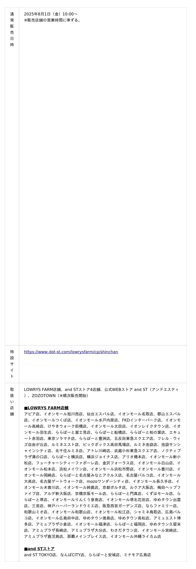 株式会社アダストリア(本部:東京都渋谷区渋谷2-21-1、代表取締役社長:木村 治)が展開するLOWRYS FARM(ローリーズファーム)は、インブランドである「Me%(ミィパーセント)」と大人気アニメ『クレヨンしんちゃん』のコラボレーションアイテムを2025年8月1日(金)に販売開始いたします。LOWRYS FARM一部店舗、and ST(アンドエスティ)ストア4店舗、公式WEBストアand ST(アンドエスティ)、ZOZOTOWNでの展開をいたします。