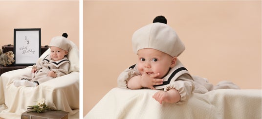 人生の大海原に出発するベビーはまるで船長に扮した水の妖精。