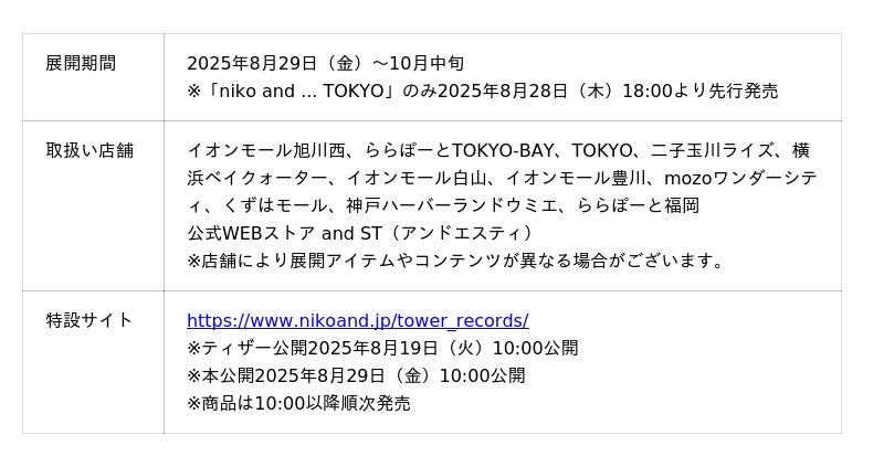 株式会社アダストリア(本部:東京都渋谷区渋谷2-21-1、代表取締役社長:木村 治)が展開するスタイルエディトリアルブランド「niko and ...(ニコアンド)」は、音楽専門店「タワーレコード」のコラボレーションアイテムを2025年8月29日(金)より「niko and ...」一部店舗および公式WEBストア and ST(アンドエスティ)にて、発売いたします。また、発売前日8月28日(木)18時からは、旗艦店「niko and ... TOKYO」にて、どなたでもご参加いただける一夜限りのローンチイベントを開催いたします。本イベントでは、コラボアイテムの先行販売に加え、YouTubeライブ企画「“GOOD” nights」の特別編として、有観客でのライブパフォーマンスを実施。ゲストにはシンガーソングライターのkiki vivi lilyと、maco maretsを迎えて特別なライブパフォーマンスをお届けします。両アーティストは、2025年9月に開催される「UNI9UE PARK MARCHE’25」※への出演が決定しており、今回のローンチイベントを通して、フェス本番へとつながる世界観を一足先に体感いただけます。イベント会場では、コラボレーション企画の世界観を体感できるブースの展開や、DJイベントを行います。
