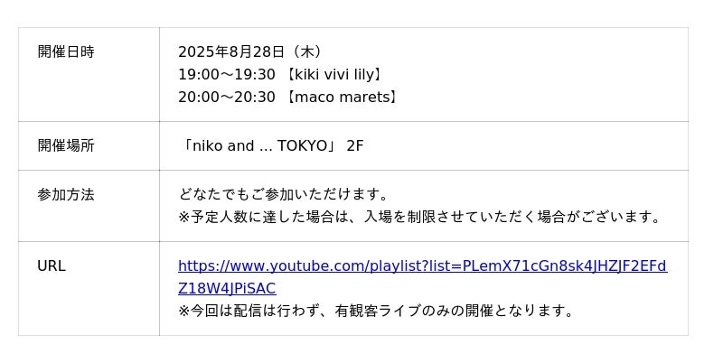 「niko and ... TOKYO」で定期的に開催しているYouTubeオンラインライブ企画「“GOOD” nights」特別編として、店内にて有観客ライブを開催します。