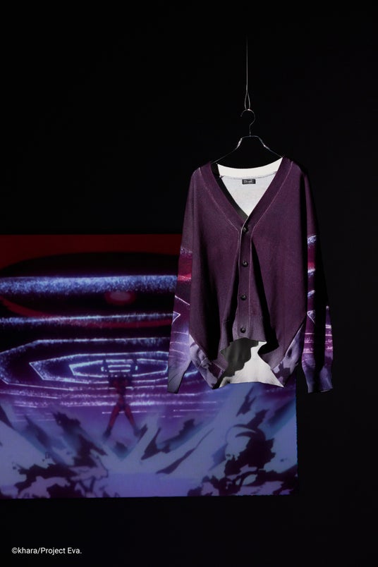 A.T.フィールド全開のシーンを大胆にプリントし臨場感のあるニットカーディガン。
