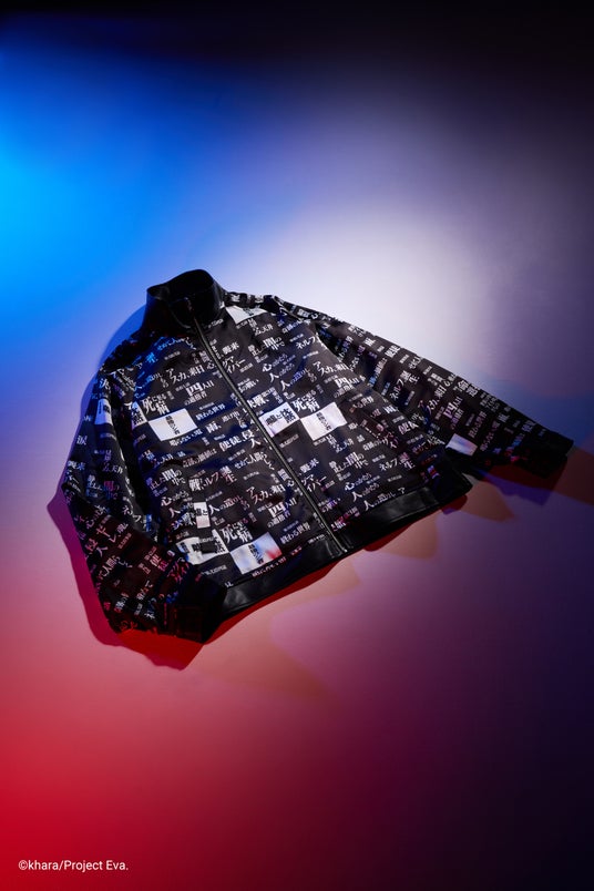 90 年代流行のトラックジャケットをベースに、袖にはオリジナルのジャガードテープの側章を使用。 リバーシブルで着用できる裏地はテレビシリーズの第壱話から最終話までのサブタイトルをプリント。