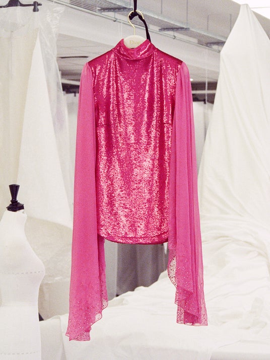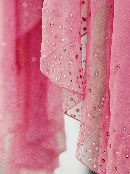 また、スパンコールとシフォンスリーブの刺繍があしらわれたピンクのドレスも着用しています。