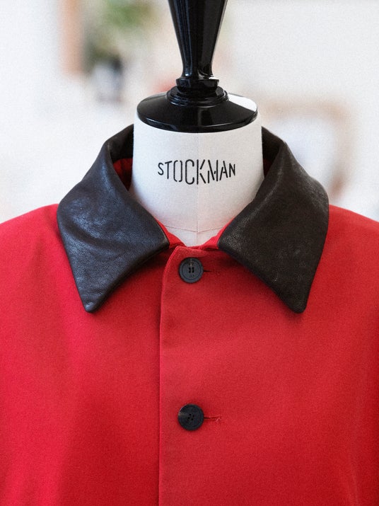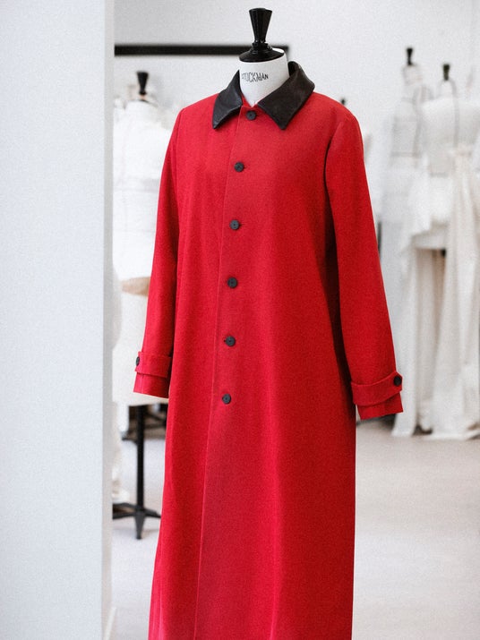 サブリナ・カーペンターは、オープニングのパフォーマンスで、ブラウンのレザーカラーをあしらったレッドコットンのコートを着用しました。
