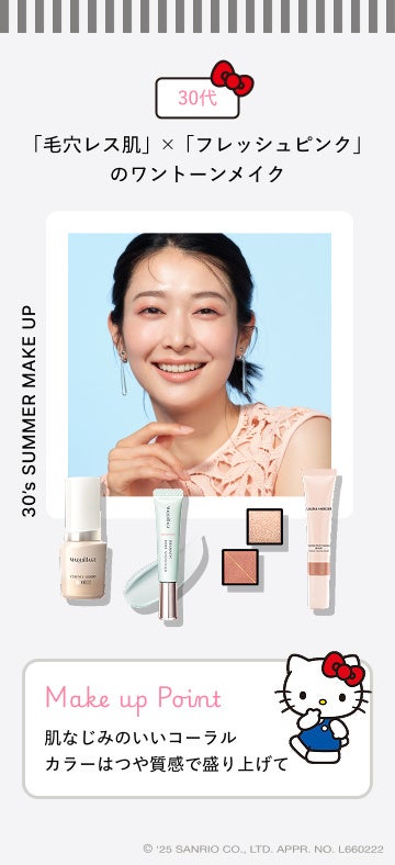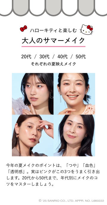 夏映えメイクのポイントである肌の”つや”、”血色”、”透明感”を、資生堂ヘアメイクアップアーティストが、20代から50代の年代別に提案・レクチャーします。ハローキティがチークやアイライン、マスカラなど、さまざまなメイクに挑戦!可愛い変身姿にも注目です。