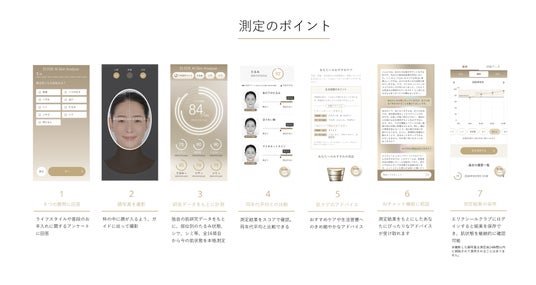 スマートフォンで簡単な質問に答えて顔写真を撮影するだけで肌を総合的に解析し、本格的な肌分析とそれに基づいたパーソナルなビューティーアドバイスを受け取れるサービスを提供します。