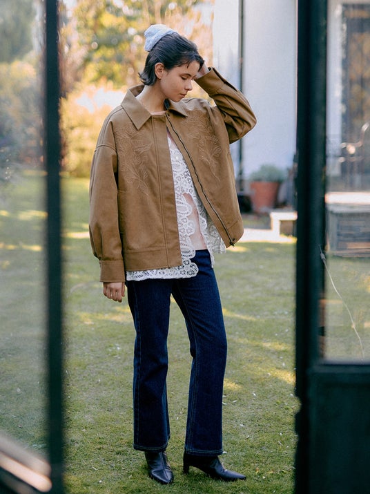 この春の一推しは、スウェードジャケットにレースシャツ、デニムを合わせたコーディネート。異素材を重ねることで甘さとラフさのバランスを楽しめる今年らしい春の装いに。