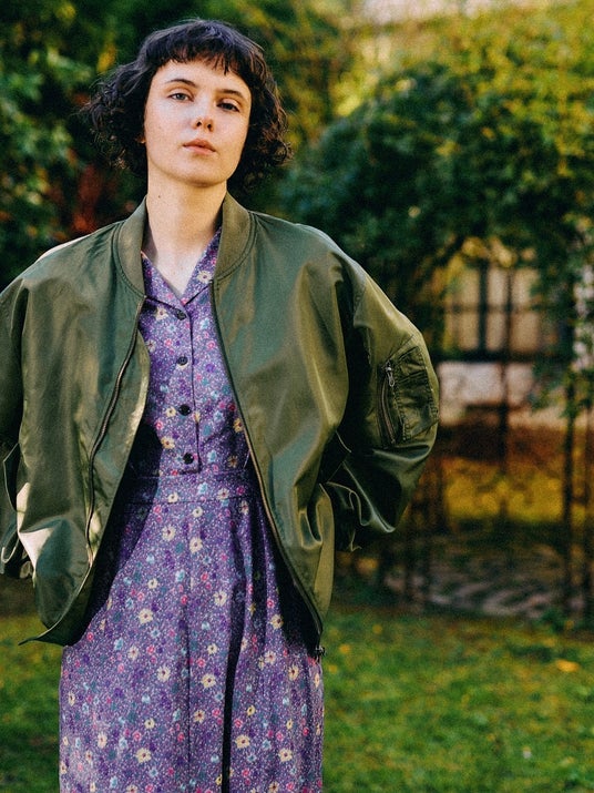 アイデアとトレンドをミックスさせたスタイリングが得意なmysty womanらしい、MA-1に花柄ワンピースを合わせたミックススタイルでは、カジュアルなアイテムにフラワーモチーフを添えることで、軽やかで女性らしい印象へとアップグレード。