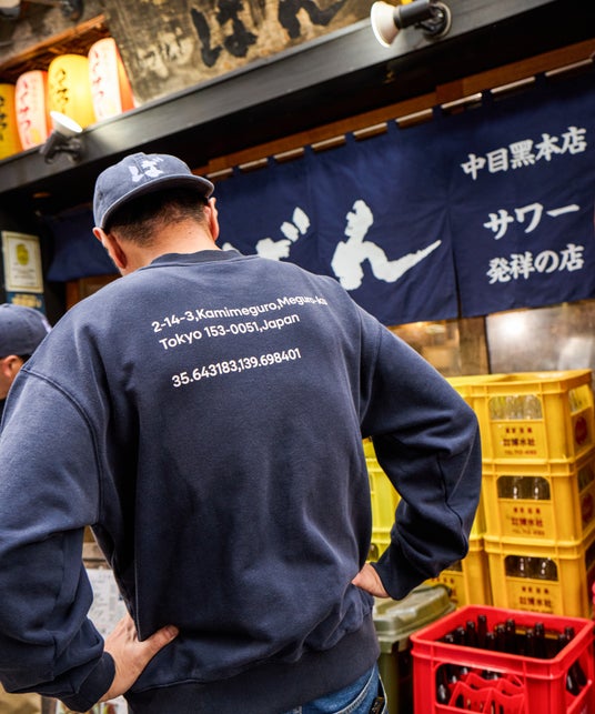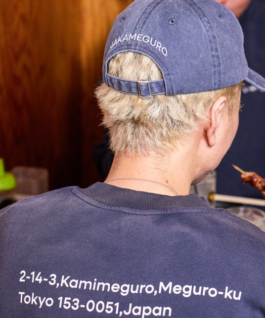 裾にはレモンサワーの作り方や、袖にはもつの部位のデザイン。下を向く時や、時計を見るふりをして確認ができるので、特にデートにも安心して着用してほしいユニークな一着に仕上げました。中目黒本店の暖簾をイメージした古着加工や身幅が広い短丈のシルエットは、トレンド感のあるデザインになっています。