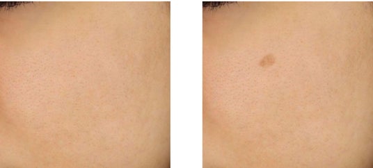 図2 シミのない肌(左)とシミが肌表面に現れた肌(右)のイメージ画像 シミのない肌の肌内部ではミ発生に向けた何らかの変化が起きているのではと考え、遺伝子レベルで検証を実施