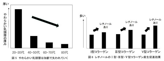 3種のコラーゲンで形成されたやわらかい乳頭層がシワ原因の一つであるメカニカルストレスを吸収し、シワを予防していることが分かりましたが、残念ながら、やわらかい乳頭層は加齢で失われていくことが明らかになりました(図5)。そこで3種のコラーゲンの産生を高める成分を探索した結果、レチノールにその効果を確認しました(図6)。今回の知見により、レチノールがシワの予防に寄与する可能性が示唆されました。