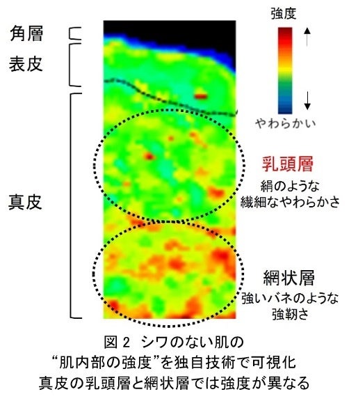 資生堂は、独自の「肌内外3D弾性イメージング技術※1」を応用して真皮上部に位置する乳頭層を「繊細なやわらかさを持った状態」に保つことがシワの予防に寄与することを明らかにし、レチノールにその機能があることを発見しました。