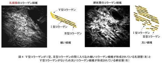 次に、やわらかい乳頭層を維持する方法を検討するために、層に存在する3種のコラーゲンを観察しました。肌では乳頭層のみに存在する希少なV型コラーゲンは、I型、III型コラーゲンとともに線維を組み立てる役割を果たし、3種のコラーゲンが互いに影響し合いながら一体化して、細く整った線維となっていることが分かりました(図4)。