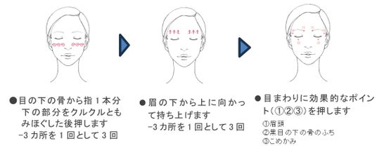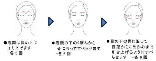 ●片手で目尻を伸ばし、もう一方の手の中指の腹を使い、上下に指を動かすようにして、やさしくなじませます