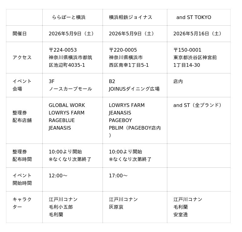 ららぽーと横浜・横浜相鉄ジョイナス・and ST TOKYOの3施設にてコナン君含むキャラクター来館イベントを開催します。