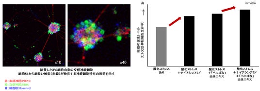 今回、iPS細胞(人工多能性幹細胞)由来のヒト交感神経細胞モデルを培養し、交感神経の酸化ストレス耐性を評価した結果、「べにばな」由来エキスとナイアシンアミドにストレス耐性を増加させる効果があることを見出しました(図5)。これらのエキスは、組み合わせることでそれぞれ単独で使用するよりも高い効果を生み出し、交感神経細胞をより健康な状態に保てることが分かりました。