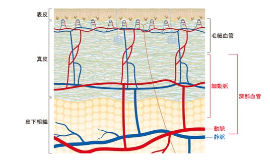資生堂の血管研究では、加齢によって毛細血管が細く衰え、肌の弾力低下につながることや、毛細血管の状態が、シミの形成だけでなく改善プロセスにおいても密接に関係していることを解明してきました。しかし、毛細血管よりも太く、深部に存在する血管の加齢変化による影響については分かっていませんでした。