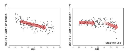 図5 表皮を中心に伝播する内部散乱光と加齢の関係(左)、真皮を中心に伝播する内部散乱光と加齢の関係(右)