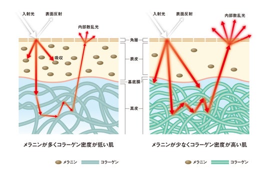 図2 メラニン量およびコラーゲン密度が肌内部における光に影響を与えるメカニズム
