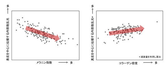 図4 表皮を中心に伝播する内部散乱光とメラニン指数の関係(左)、真皮を中心に伝播する内部散乱光とコラーゲン密度の関係(右)