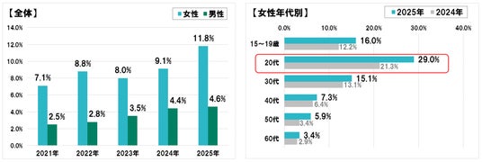 また、アイビューティーサロンでは、1年以内の利用率が女性11.8%と前年に比べ2.7ポイント増加。特に20代女性では約3人に1人が利用しており、日常的なケアとして定着しつつあることが明らかになりました。
