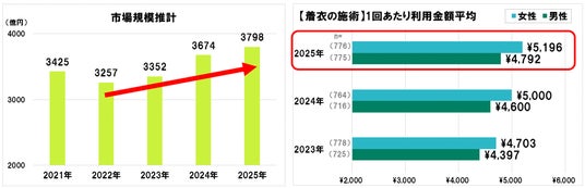リラクゼーションサロンの市場規模は、2022年から3年連続で拡大し、2025年は3798億円とここ5年で最大に。特に着衣の施術の1回あたり利用金額が上昇傾向にあり、2025年は女性5,196円、男性4,792円といずれもここ3年で最高額に。リラクゼーションサロンの市場規模推計(※9)・【着衣の施術】1回あたり利用金額平均(※10)