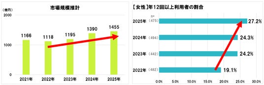 ■市場規模は3年連続で拡大し1455億円。女性は毎月利用する高頻度層の割合がここ4年で最高値に