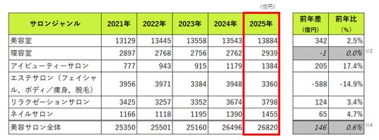 (※4)美容サロン全体の前年差・前年比は、理容室の2025年女性分(178億円)を除く