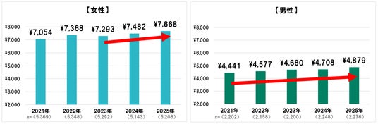 女性は2年連続で1回あたり利用金額が上昇し、2025年はここ5年で最も高い7,668円に。男性は上昇を続け、2025年は4,879円とここ5年での最高額を記録。