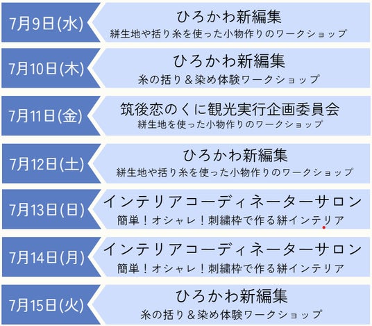 大人も子供もたのしめる内容盛りだくさんの絣生地や、括り糸を使った小物、ファブリックパネルなどのワークショップを日替わりで開催します。