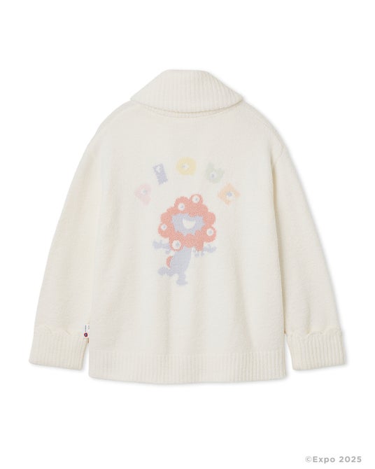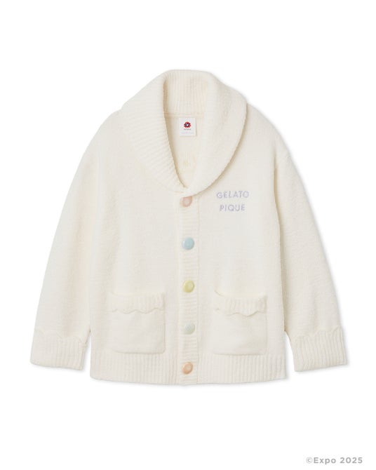 ユニセックスのショールカーディガンは、水滴のように透明感のあるボタンに加え、ミャクミャクのシルエットをイメージした袖とポケットのスカラップデザインも注目ポイントです。