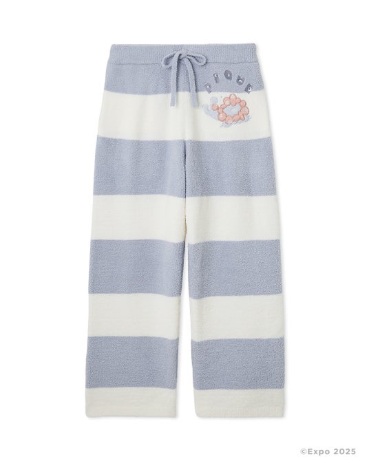 雨上がりに虹をみつけることが特技のミャクミャクをイメージして、ジェラート ピケらしいわくわくするパステルカラーでロゴやボーダー、ボタンを表現しました。愛らしいミャクミャクのおやすみシーンに癒されるデザインです。ロングパンツにはプルオーバーとお揃いのアップリケを施しました。