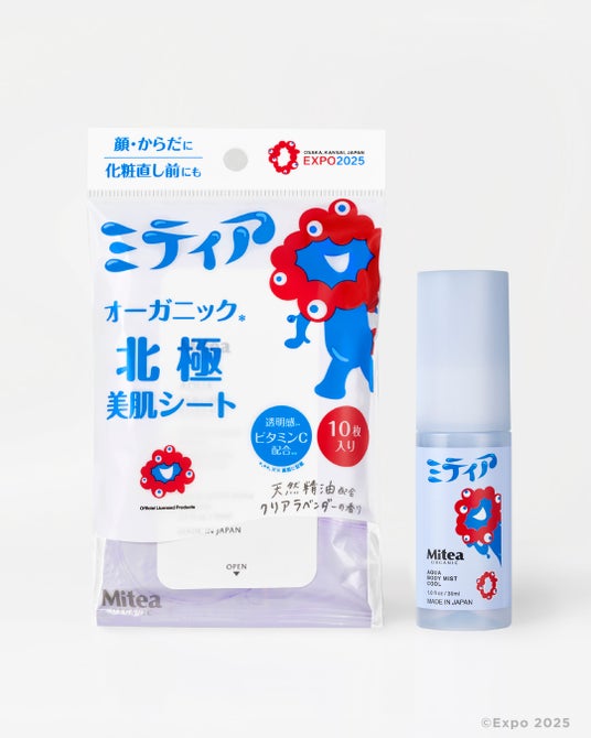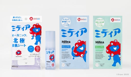Mitea ORGANICからは、ミャクミャクをいきいきとみずみずしく表現した、夏を快適に過ごすためのボディ&スキンケアアイテムがラインアップ。「水」と「オイル」にこだわり、細胞から美しくすこやかな肌を目指すMitea ORGANICと、”細胞と水がひとつになったことで生まれた”ミャクミャクのシナジーから生まれたコラボレーションから、夏季限定発売の冷感ボディミストや冷感シート、人気のシートマスク2種がミャクミャクデザインで登場いたします。