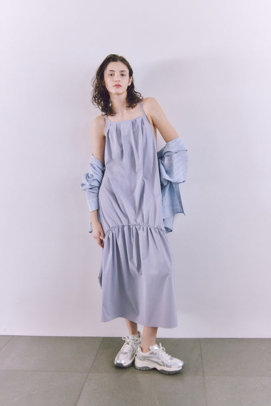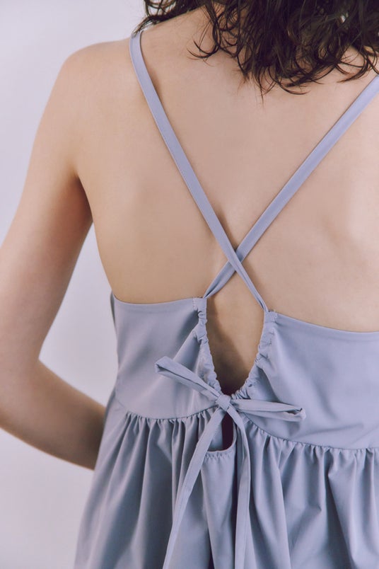 キャミソールワンピースはタフタ素材に女性らしいリボンディテールをあしらったバックシャンデザインがポイント。セットでも別々でも着用できる便利なセットアイテムです。