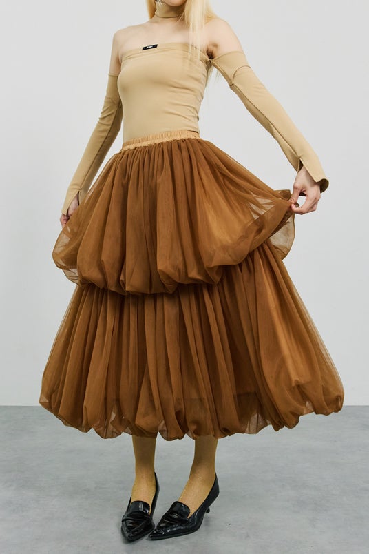 “ジェリーフィッシュ”という名前の通り、クラゲを思わせる揺らめきが美しいスカート。ライトブラウンはショップ先行カラーです。