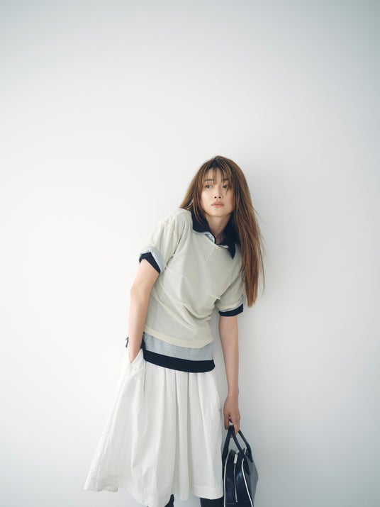 体型を拾わないサイズ感でトラッドなスタイリングを叶えるトレンドのポロニット。